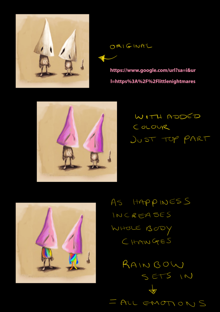 With this new concept in mind, it drew my focus towards the nomes feelings, that they may light up with more colour, as happiness increases. Each time another nome is saved, the music creates a nicer atmosphere, other instruments could start playing, and maybe this could be done in a slight humorous way to show their individual characteristics and personalities. After all they were once children.