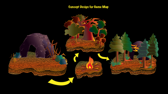 My initial inspiration was from some isometric maps I had been researching before hand, as a way of allowing the player to understand where they start in the game’s first level for; Keep It Burning, and what the end goal was, ie. finding another cave dwelling… bigger, more equipped, and more protected from predators.