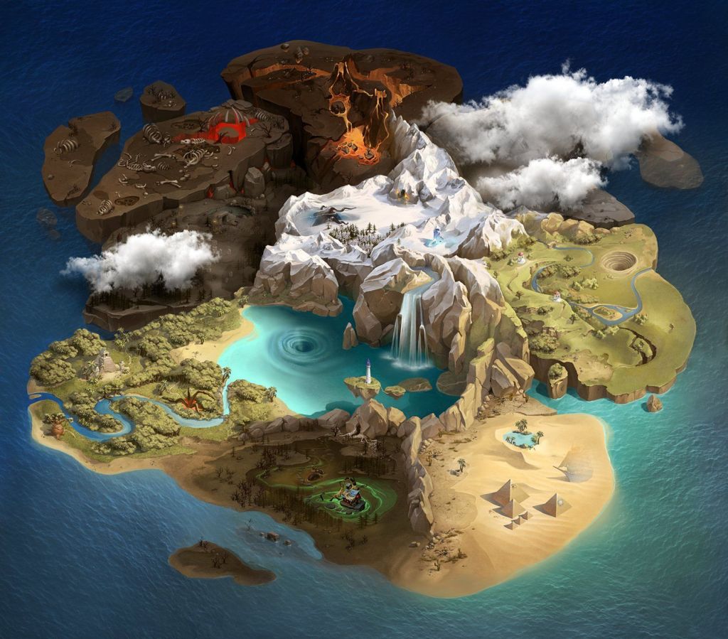 This is what I used as my world map inspiration layout, as it clearly shows 4 areas, and some hidden by cloud. I was sure that everyone would be keen on the layout, as it fit more perfectly with our in game pixel art style too. I assume this was the reason that I didn’t receive feedback, due to me personally not doing pixel art, even though we said at the beginning of the project that we would mix textures.!? Luckily I was right, and they all was keen for me to experiment with the style…